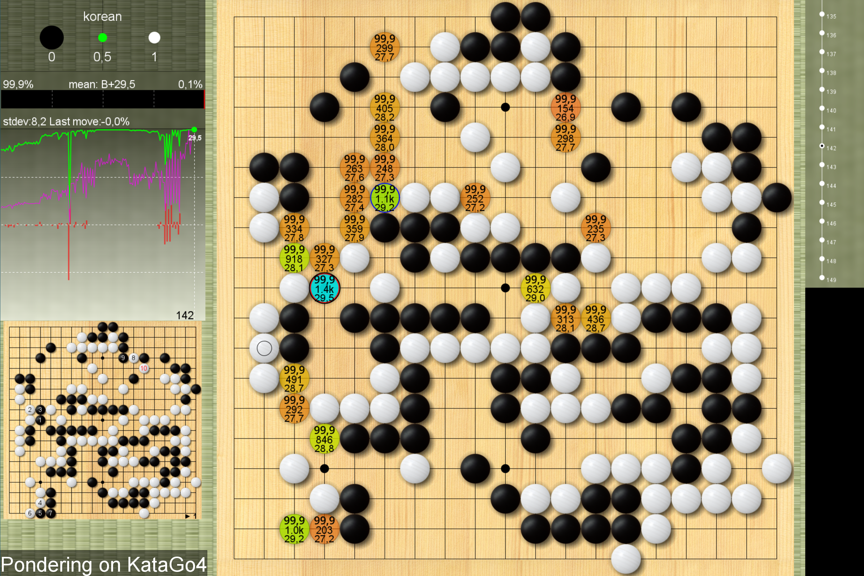 Even though AlphaGo was eventually retired by its creators they freely published their methods which made it possible to reimplement the approach by anyone willing to do so. This lead to the development of Leela Zero, an open source Go engine, which was trained collectively by the community crowd-pooling their computing resources - an ingenious approach in the absence of Google's computing power. Out of further community-driven improvements, KataGo was born, an even stronger version with more features supporting analysis and different playing formats. Additionally, other commercial engines powered by neural networks are available in the market. Together with their free siblings they make superhuman gameplay and analysis available to everyone with a computer.